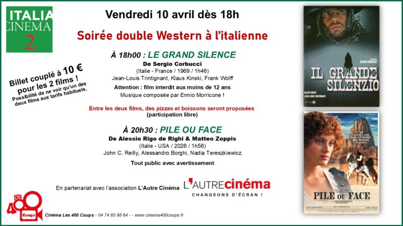 Du 8 avril au 5 mai 2026 Le cinéma Les 400 Coups et l’association L’Autre Cinéma proposent un focus sur le cinéma italien. Au Programme : Avant-Première, Musique & cinéma, Westerns, Documentaire, cinéma... Pour en savoir plus