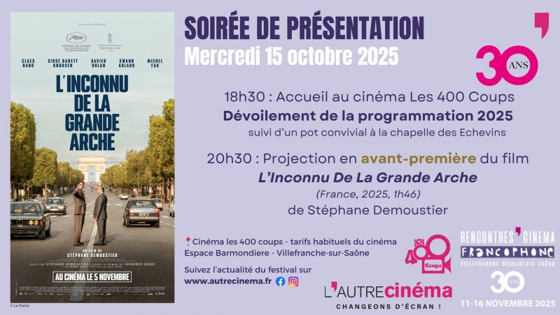 Les 30es Rencontres du cinéma francophone en Beaujolais se dévoilent…Après la rentrée, L’association L’Autre Cinéma affine sa programmation de films francophones pour tous les passionnés de cinéma. Cette 30e édition se tient du 11... Pour en savoir plus