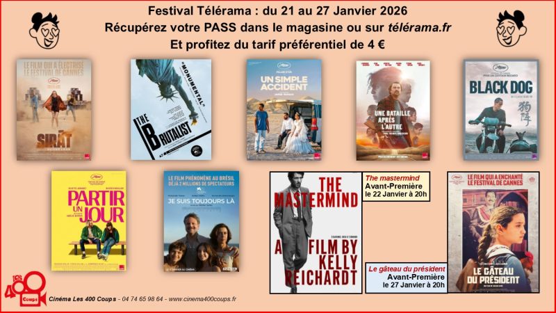 Du mercredi 21 au mardi 27 janvier 2026 Pour la 28ème édition, TELERAMA et l’AFCAE vous propose de (re)découvrir en salle les films qui ont marqué l’année 2025. Récupérez un PASS FESTIVAL dans... Pour en savoir plus