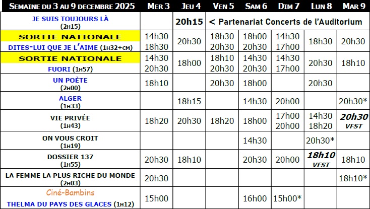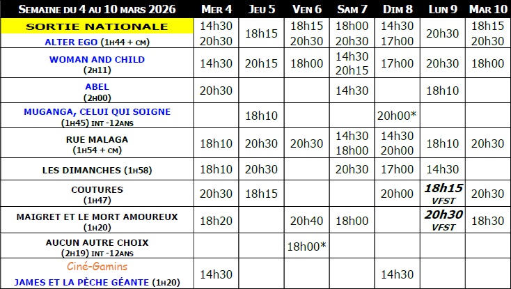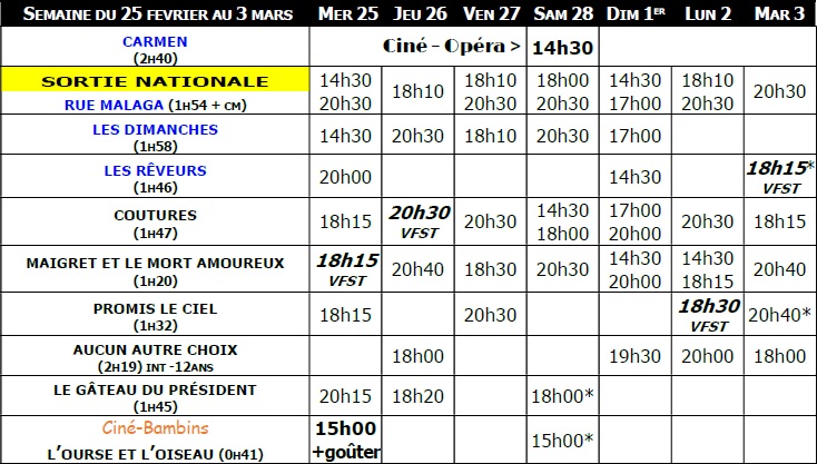 Les titres en couleur bleu indiquent les nouveaux films de la semaine dans notre cinéma.